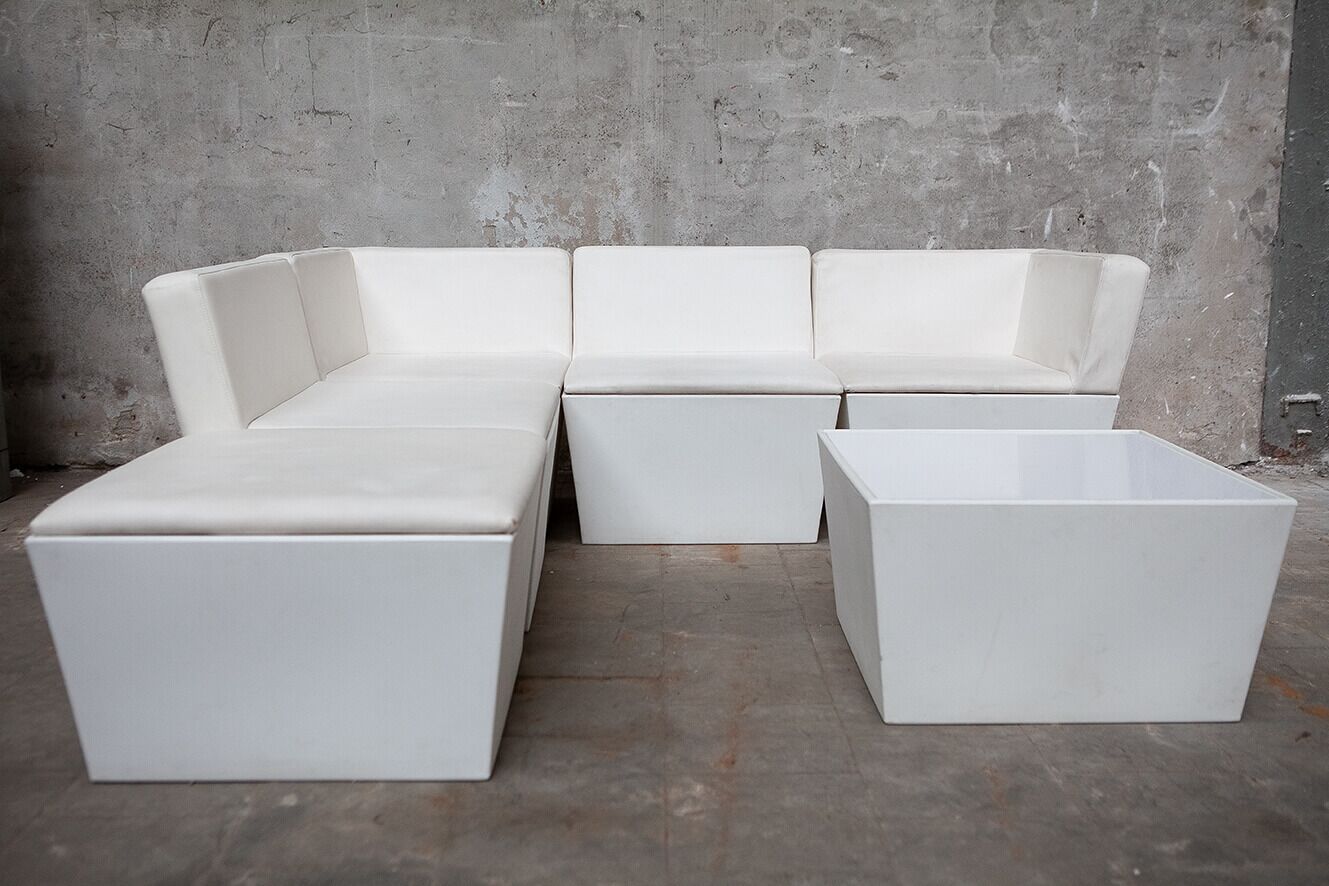 Hoekleuning, 3x rugleuning, poef en tafel.